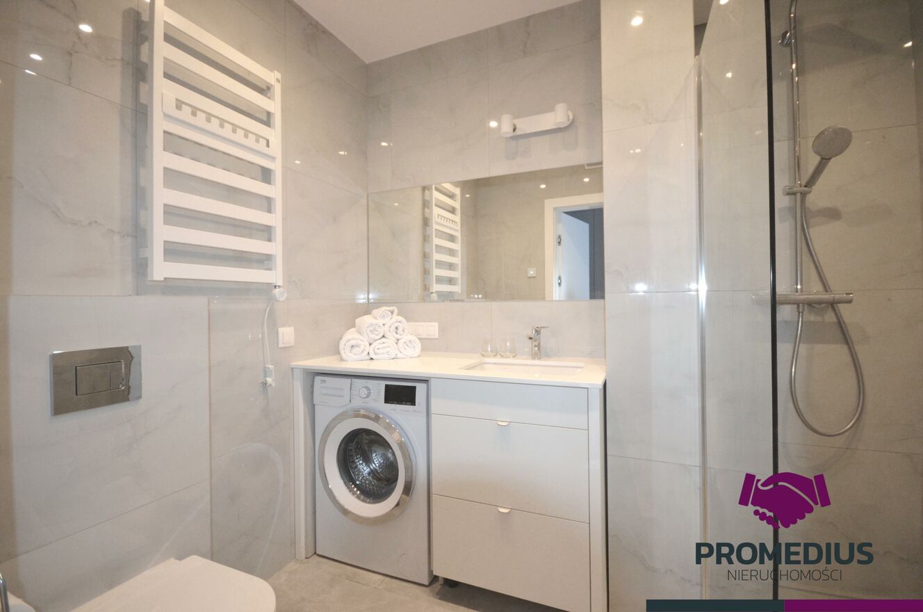 W pełni wyposażona łazienka, tj. duża kabina prysznicowa walk in 180x80 cm, zestaw prysznicowy, deszczownica firmy Grohe, szafka z umywalką, pralka, bateria, lustro, toaleta, oświetlenie górne i nad lustrem, grzejnik drabinkowy z grzałką i timerem Terma, kafle na podłodze pod kolor brodzika - gres rektyfikowany Antico Matt 60x120 cm, toaleta z deską samoopadającą.