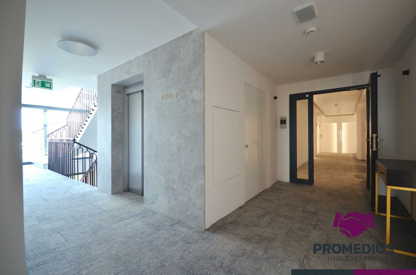 Wyposażenie i wykończenie apartamentu: klimatyzacja, ogrzewanie podłogowe firmy ROTH, drzwi wewnętrzne White Gloss INTERDOOR, oświetlenie LED w sufitach, inteligentna klamka z możliwością zdalnej kontroli generująca m.inn. kody wejściowe, drzwi zewnętrzne samoopadające White Gloss INTERDOOR, wideofon z podglądem na wejście frontowe i korytarze, zasłony elektryczne, klimatyzator, TV 55', witryna balkonowa suwana Aluprof HS trójszybowa, na podłodze płytki z gresu o strukturze bielonego drzewa ułożone w jodełkę.