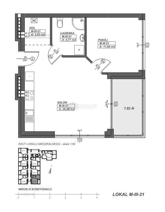 - salonu z aneksem kuchennym o pow. 26,89 m2